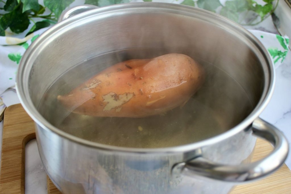 - Cocción: Pela y corta la batata en cubos, y cocínala al vapor o en agua hirviendo hasta que esté tierna (unos 15-20 minutos). Escúrrela bien.
